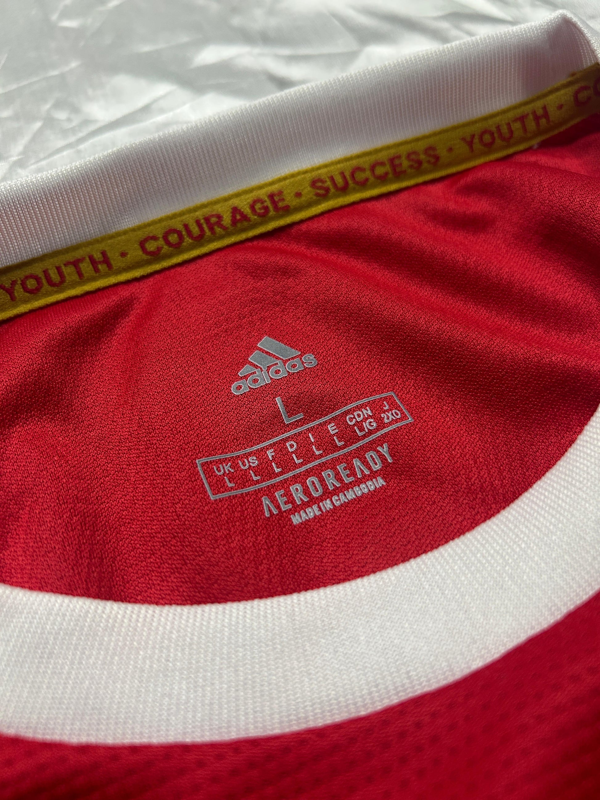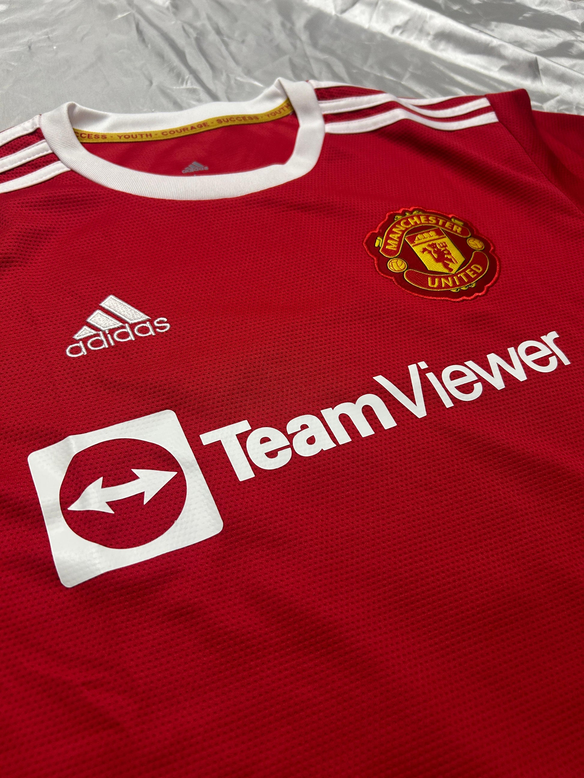 Jersey original Manchester United musim 2021/2022 keluaran Adidas, dengan sponsor utama TeamViewer di bagian depan. Jersey ini merupakan edisi saat Cristiano Ronaldo kembali ke Manchester United setelah 12 tahun, sehingga sangat ikonik bagi para fans.