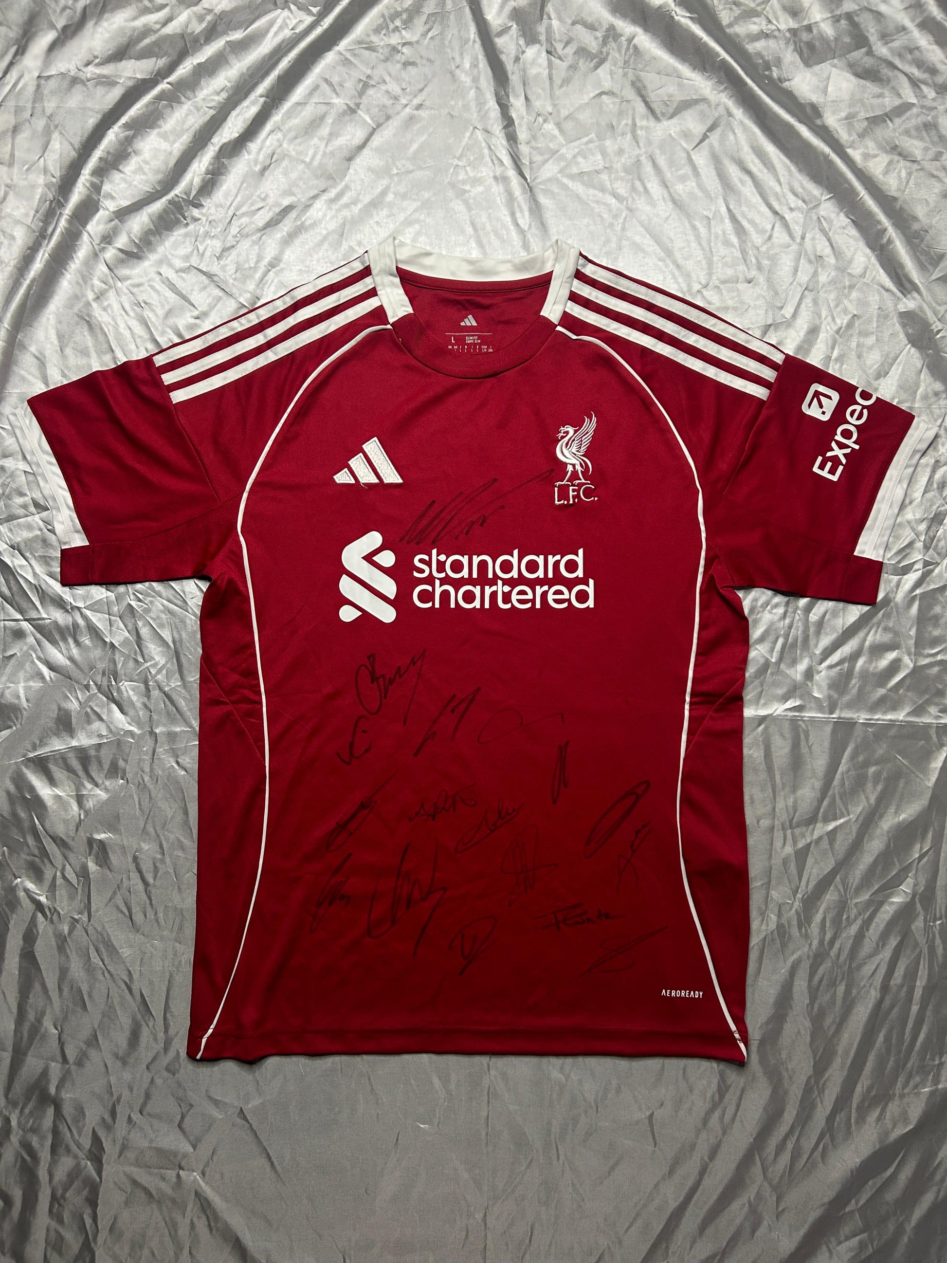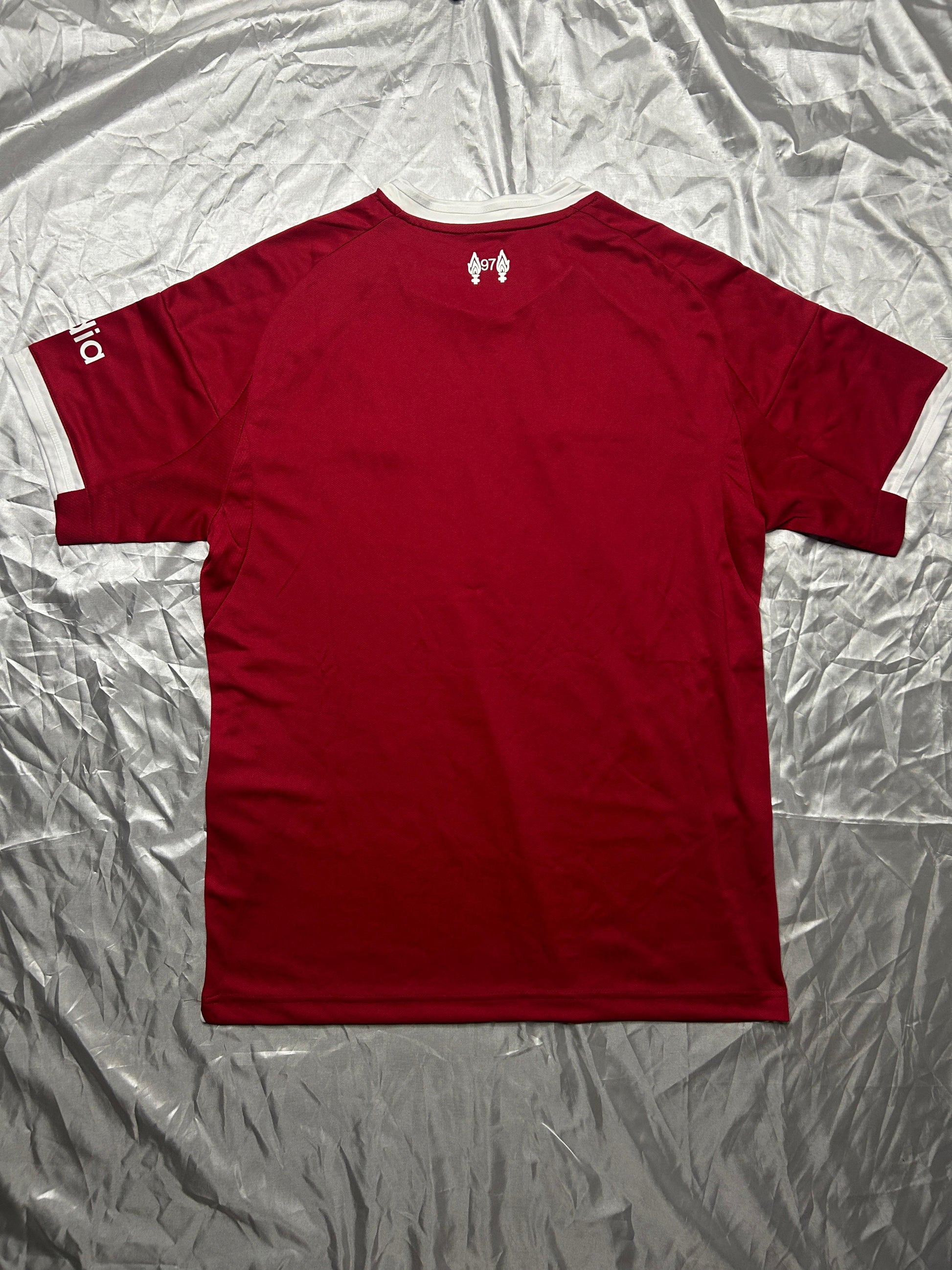 Warna dominan: Merah khas Liverpool dengan garis putih di bahu dan leher.