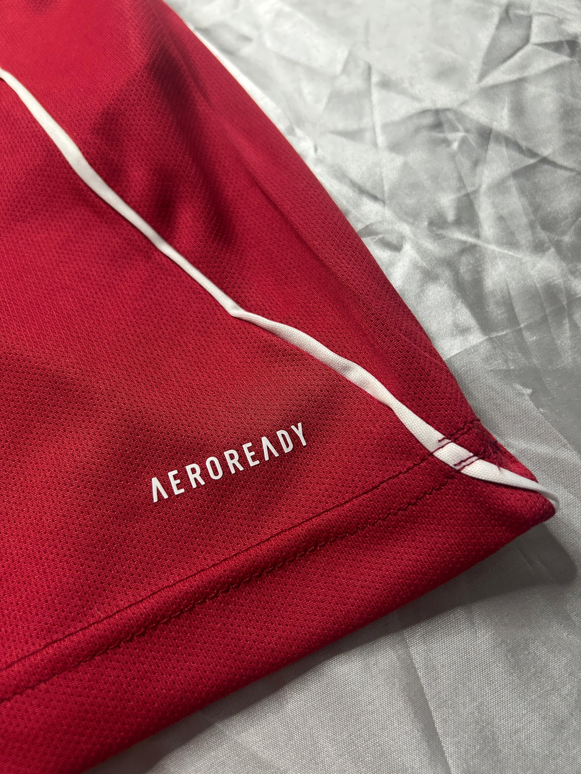 Jersey kandang Liverpool FC warna merah ikonik dengan sponsor Standard Chartered, diproduksi oleh Adidas. Jersey ini tampil dengan desain modern khas Liverpool, lengkap dengan tiga garis Adidas di bahu, logo L.F.C di dada, serta teknologi AEROREADY untuk kenyamanan.